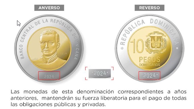 Santo Domingo, RD. – El Banco Central de la República Dominicana informó que a partir del lunes 1 de septiembre del presente año comenzarán a circular las nuevas monedas metálicas de 10 pesos, correspondientes al año 2024.