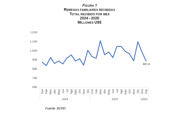 Santo Domingo, RD. El Banco Central de la República Dominicana (BCRD) informa que, entre enero y febrero de 2026, las remesas recibidas alcanzaron la cifra de US$1,870.4 millones, aumentando 1.0 % en términos interanuales. Particularmente en el mes de febrero, se recibieron US$887.6 millones, monto menor en US$29.4 millones al recibido en febrero de 2025, y evidentemente menor al recibido en enero de este año en US$95.2 millones, pues enero es un mes donde se recibe un mayor flujo de remesas por efecto de las visitas de los dominicanos no residentes.
