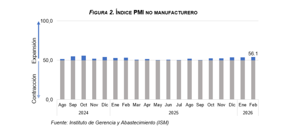 No obstante, el índice de gestores de compras (PMI, por sus siglas en inglés) no manufacturero del Instituto de Gerencia y Abastecimiento (ISM) registró un valor de 56.1 en febrero, superior al 53.8 de enero, lo que indica una expansión del sector servicios. Este sector concentra una proporción importante del empleo de la diáspora dominicana, lo que contribuyó a amortiguar parcialmente la caída del empleo.