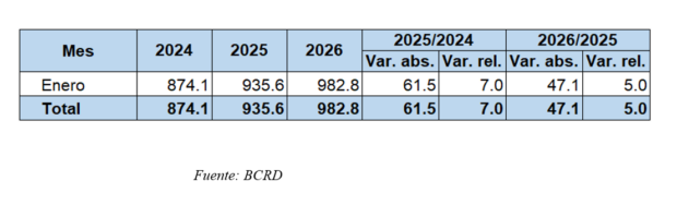 Santo Domingo, RD. El Banco Central de la República Dominicana (BCRD) informa que, durante el mes de enero de 2026, las remesas recibidas alcanzaron la cifra de US$982.8 millones, lo que representa un aumento de 5.0 % en comparación con el mismo mes del año anterior.