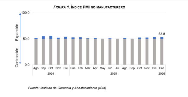 Adicionalmente, se resalta que el índice de gestores de compras (PMI por sus siglas en inglés) no manufacturero del Instituto de Gerencia y Abastecimiento (ISM por sus siglas en inglés) registró un valor de 53.8 en dicho mes, al igual que en diciembre de 2025, marcando el decimonoveno mes consecutivo de expansión en el sector servicios, donde se emplea gran parte de la diáspora dominicana.