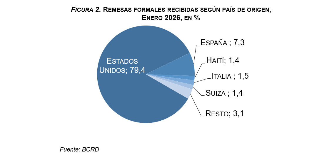 El BCRD destaca también la recepción de remesas por canales formales desde otros países en el mes de enero, como España con un 7.3 % del total, siendo este el segundo país en cuanto al total de residentes de la diáspora dominicana en el exterior.