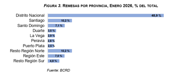 Respecto a la distribución de las remesas recibidas por provincias, el BCRD señala que el Distrito Nacional recibió una proporción del 48.9 % durante enero, seguido por las provincias de Santiago y Santo Domingo, con un 10.2 % y 7.1 %, respectivamente. Esto indica que unas dos terceras partes de las remesas (66.2 %) se reciben en las zonas metropolitanas del país.