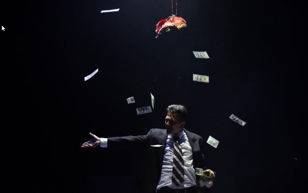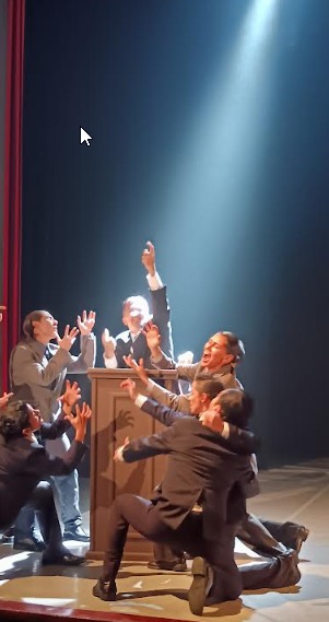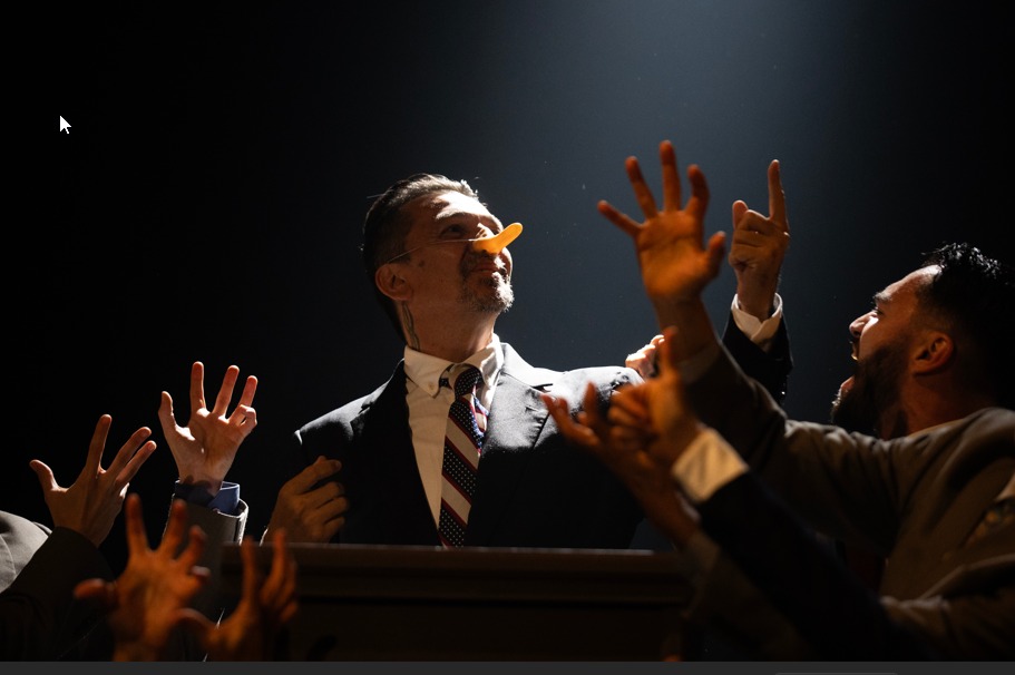 Resalta en el trabajo la coordinación corporal perfecta, sincrónica con la labor previa y disciplinada de investigación de su tema: los políticos y gobernantes. Se percibe una búsqueda de tópicos que se atrevan y conecten.