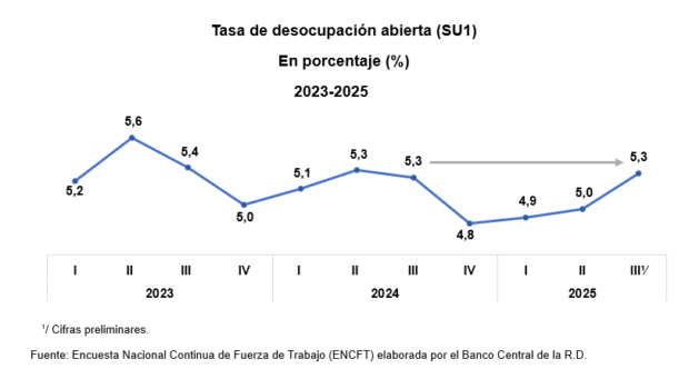 El desempleo abierto se mantuvo estable. La tasa de personas que están sin trabajo y buscando empleo activamente se ubicó en 5.3 %, el mismo nivel observado en el tercer trimestre de 2024.