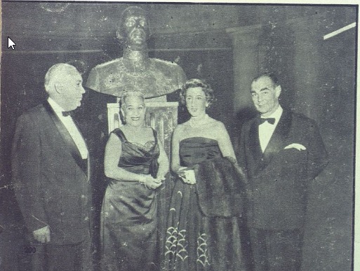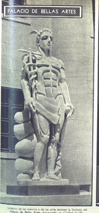 Esculturas de Antonio Prats Ventos en las puertas del Palacio de Bellas Artes. Demolidas en 1969. FOTO: Álbum de Oro de la Feria de la Paz