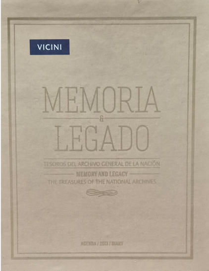Memoria y legado. Tesoros del Archivo General de la Nación. Agenda 2013. Grupo Inicia. 2013. Una joya editorial que vale lo imaginable hoy. Es una publicación relativamente pequeña, 6 x 8 ¾ de pulgadas, que tiene su valor en la documentación histórica realizada con criterio que reproduce, tras una revisión de los fondos fotográficos y documentales del Archivo General de la Nación. La portada es modesta, nada llamativa, ejecutada en gris con terminación en espiral y envuelto todo en caja editorial. Un pequeño tesoro. Los editores son Sahira Fontana y Gérber García, los textos de María de Moya, el referencista es Raylin Calvo y el diseño de www.brandiao.com. La impresión Amigo del Hogar.